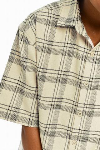 This shirt has a collar, short sleeves, front buttons, an all-over check print, and a straight hem. Complete the look with a t-shirt, joggers, and sneakers.